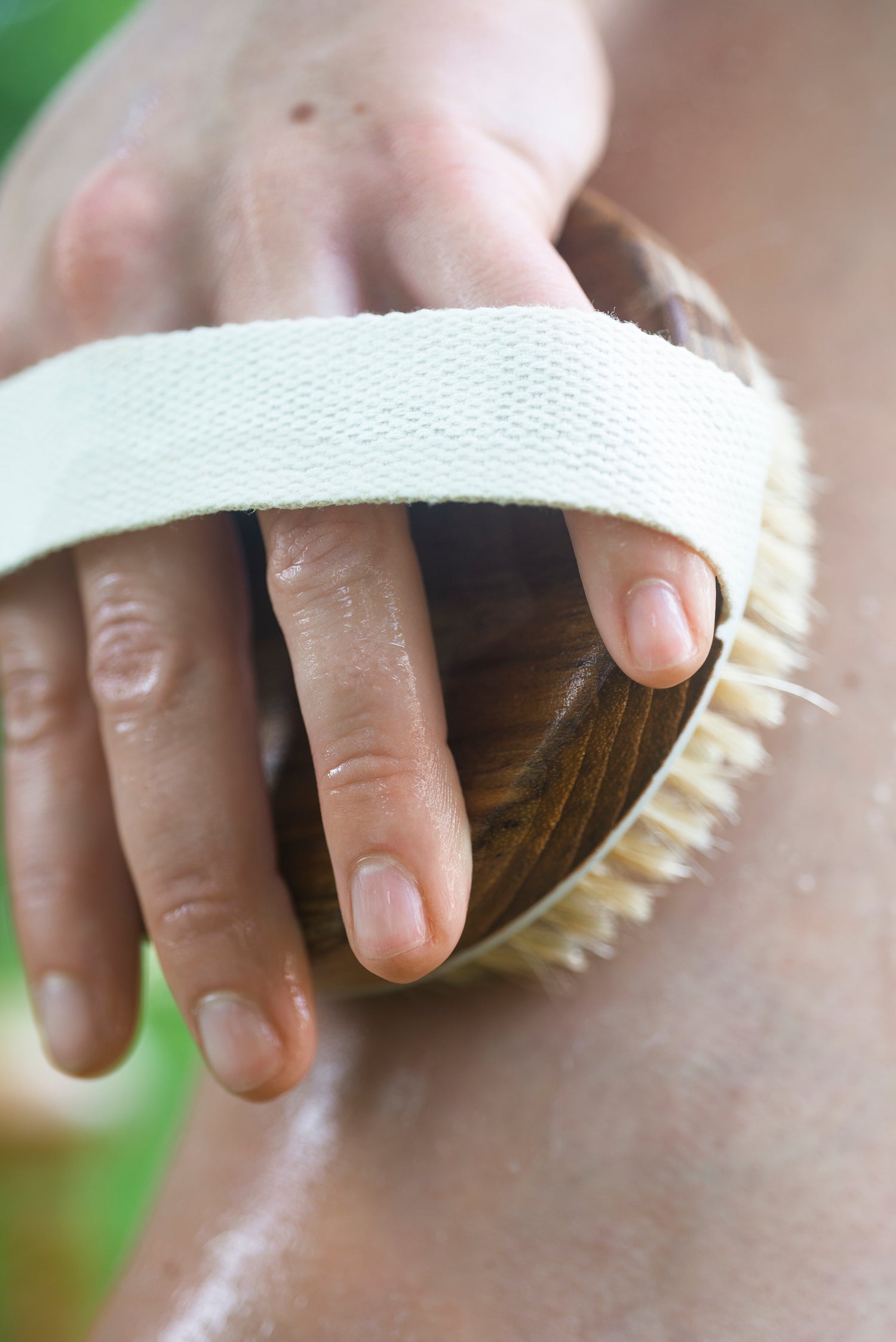 Dry brushing is a centuries old practice of brushing the skin gently, while dry, before you shower. Beginning at the feet using small even strokes move your way up towards the heart or the center of the body. You will likely brush an area 2-3 times and then move up.Be sure to move in a clockwise fashion when you get to your belly. Don't forget your underarms, backs of the knees, breasts and throat, all areas that need assistance with lymphatic drainage.